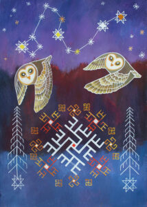 “Pūķa zvaigznājs, pūces un pūķa zīmes” – Akrils, audekls. 50x70cm. (Nr. 363)