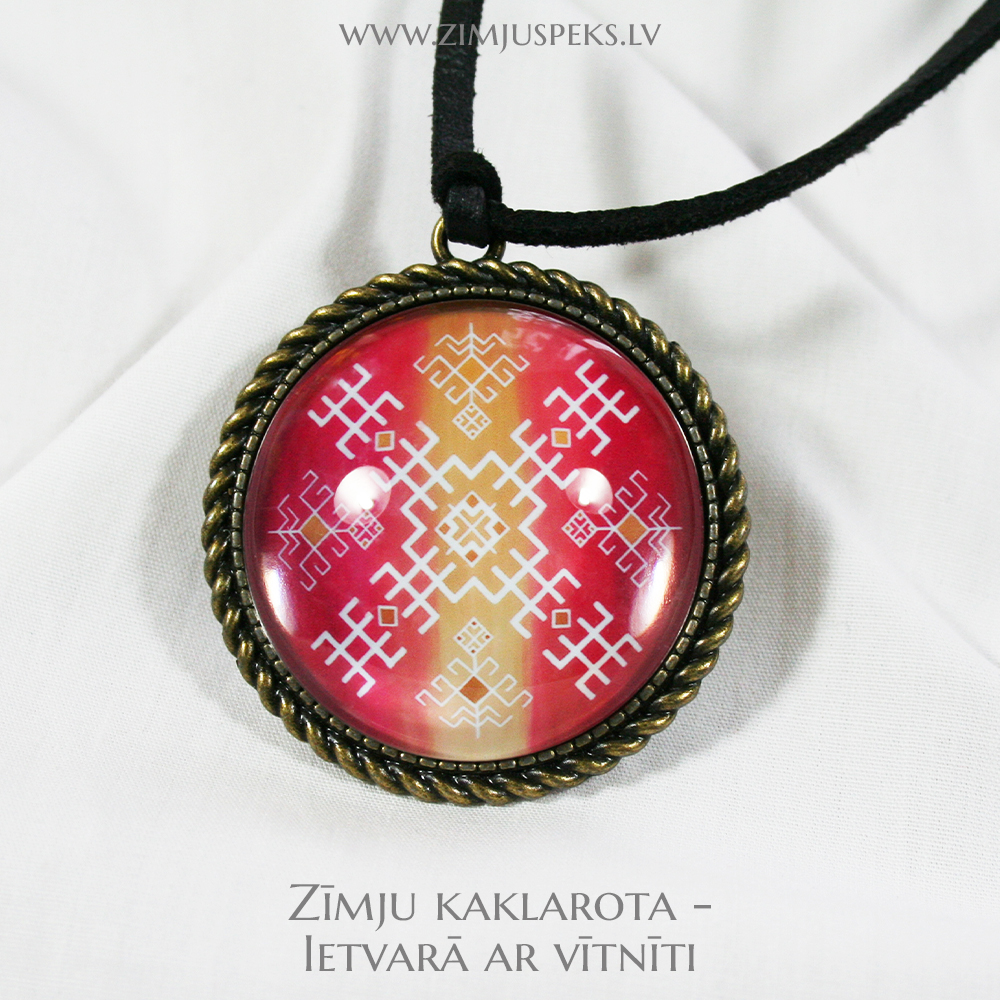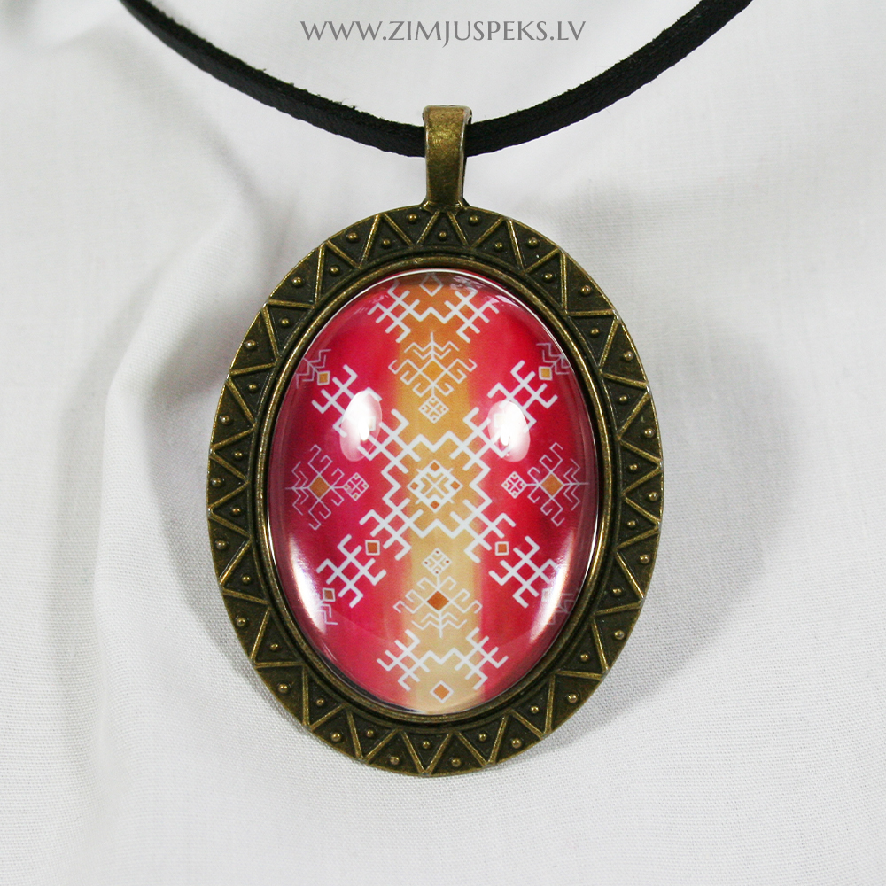 Latviešu zīmju amulets metāla ietvarā ar stikliņu un zamšādas aukliņu, pieejams piecos ietvaru veidos.